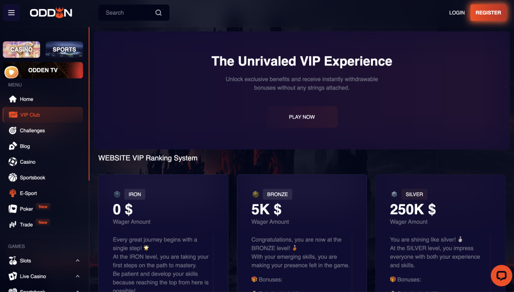 The VIP Club at Odden Casino is structures around a tiered loyalty system starting at the Iron level and reaching all the way up to the exclusive Ultra tier. There are eight levels in total and progression is based on the total amount a player wagers, starting from as little as £0 and going up to an unrealistic £1 billion. As players move up the ranks they unlock improved benefits including rakeback rates that increase from 0.05% at Bronze to 0.16% at Legend, higher withdrawal limits and periodic cash bonuses. However, these rewards tend to be modest at the lower levels (e.g. a £10 bonus at Bronze) and only start to become truly worthwhile for high-stakes players. The top tiers offer the most significant perks including generous bonuses, elevated withdrawal limits and more personalised support.